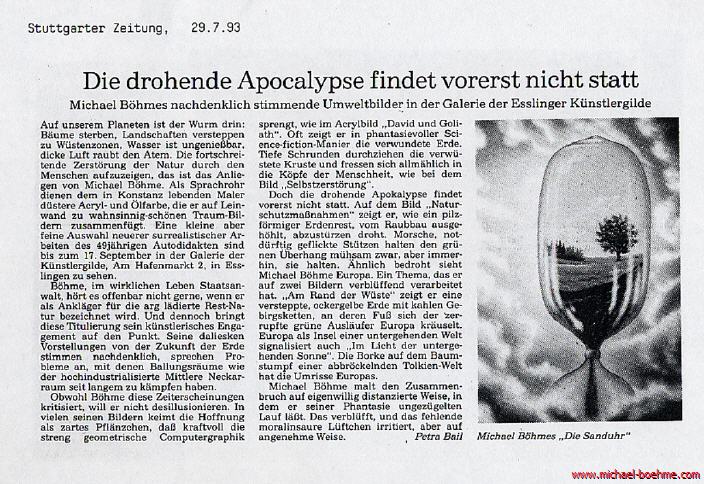 A few works from his rich oeuvre should be mentioned as examples: "The Hourglass" demonstrates the trickling of a green natural landscape into gray, dead and poisonous dust - a possible threatening fate of all earthly life. When will this clock run out?