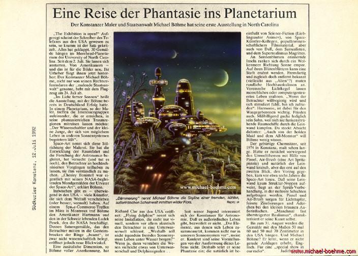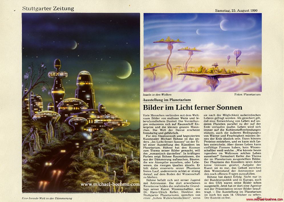 Michael Böhme began his steep career with his first exhibition "Our future begins today" in the Stuttgart planetarium in autumn 1984. His second exhibition "Life under foreign suns" in the Stuttgart planetarium in autumn 1985 was dedicated to the exciting topic of extraterrestrial life forms